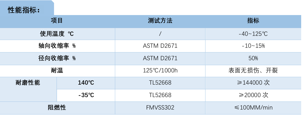 材料: PET+PE特点:◆使用温度:-40℃~125℃◆收缩温度:125℃◆收缩倍率:2:1◆标准颜色:黑(其它颜色需定制)◆阻燃: FMVSS 302◆耐磨◆抗震、降噪应用领域: 被广泛应用于汽车管路、汽车线束、工程机械线路耐磨防护。